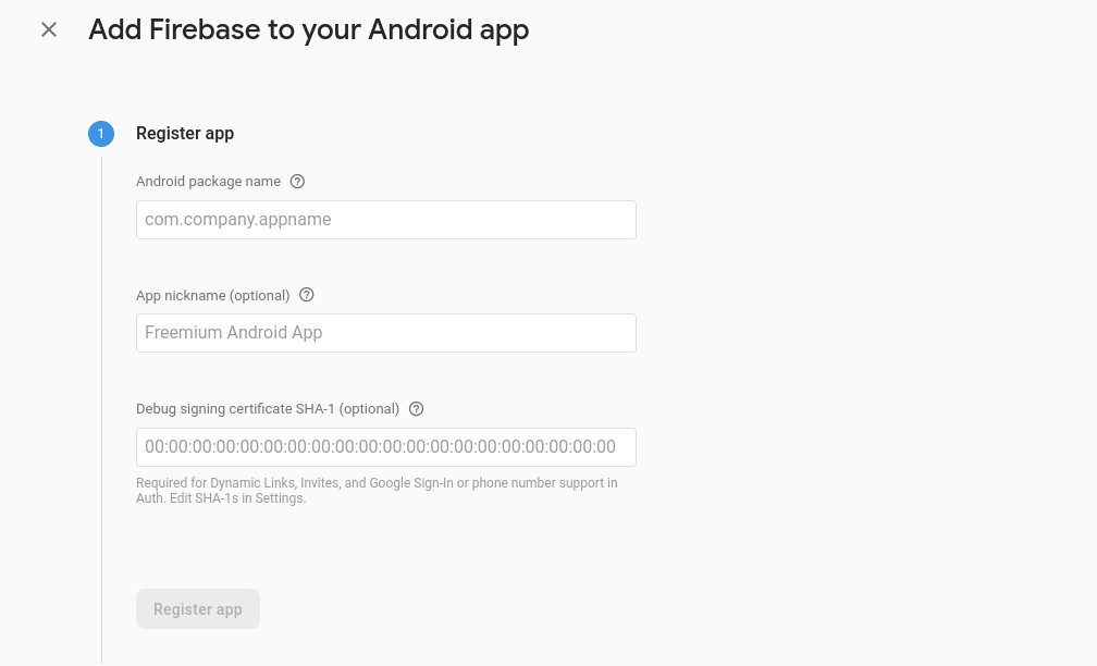 1. Register your Android app by providing the following details: