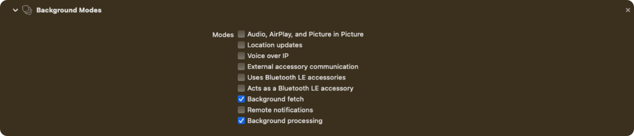 Select ‘Background Fetch’ and ‘Background Processing’ options by ticking them.
