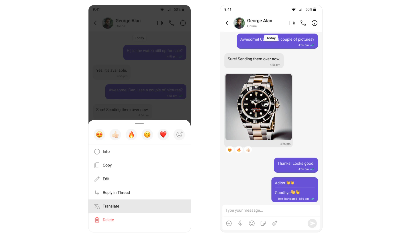 The Message Translation extension in CometChat is designed to translate any message into your local locale. It eliminates language barriers, making the chat more inclusive. For a comprehensive understanding and guide on implementing and using the Message Translation Extension, refer to our specific guide on the Message Translation Extension. Once you have successfully activated the Message Translation Extension from your CometChat Dashboard, the feature will automatically be incorporated into the Action Sheet of MessageList Component component of UI Kits.
