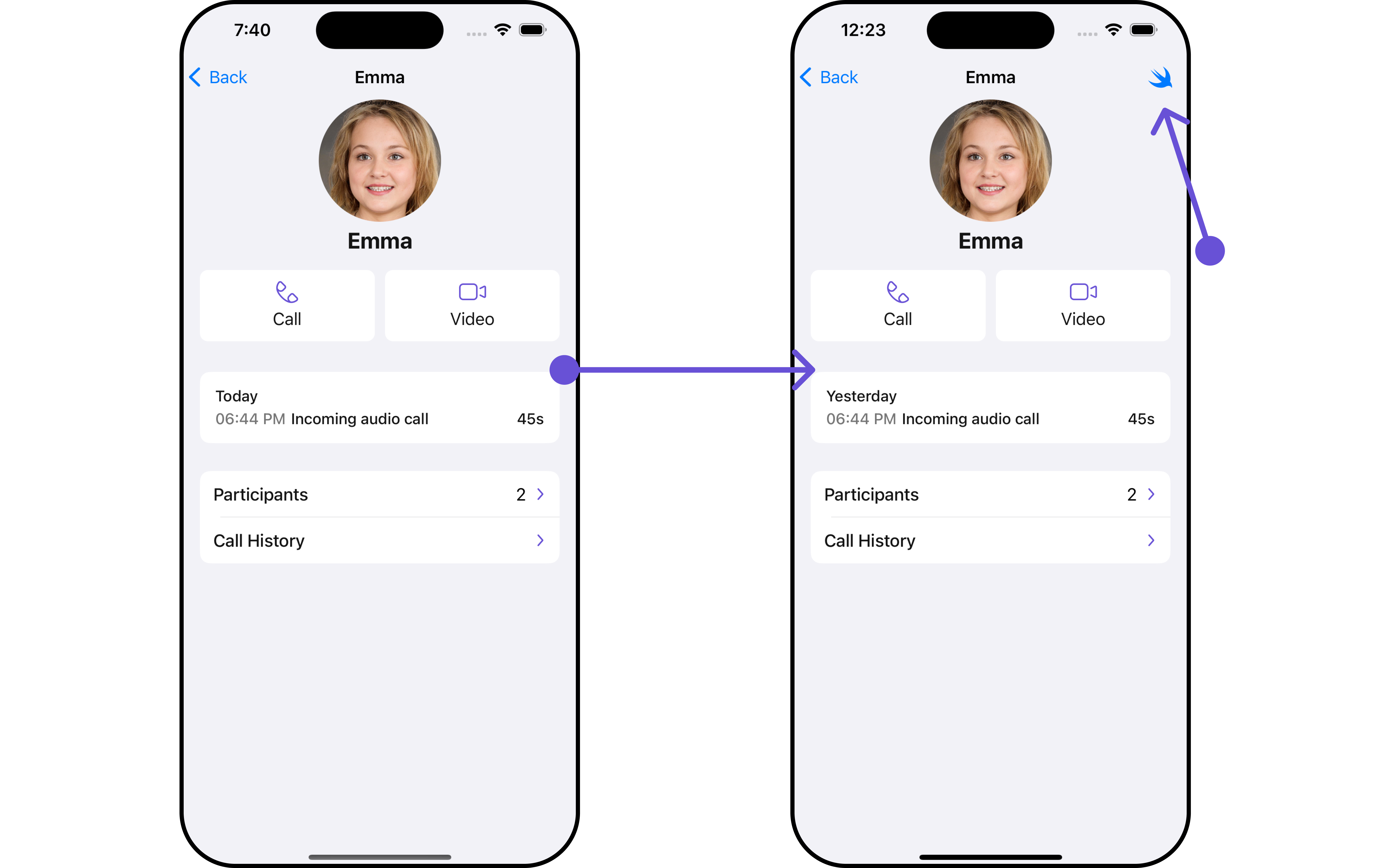 Ensure to pass and present CometChatCallLogDetails. If a navigation controller is already in use, utilize the pushViewController function instead of directly presenting the view controller.